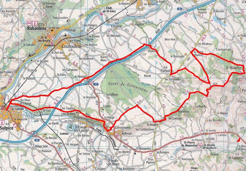 Saint Sulpice, Le Pendut, Le lissou, D13, Parisot, D87, Les Calmettes, La Pierre Plantée, Saint Maurice, D15, D19, Les Galiniers, D38, Giroussens, Saint Waast, D631 Saint Sulpice