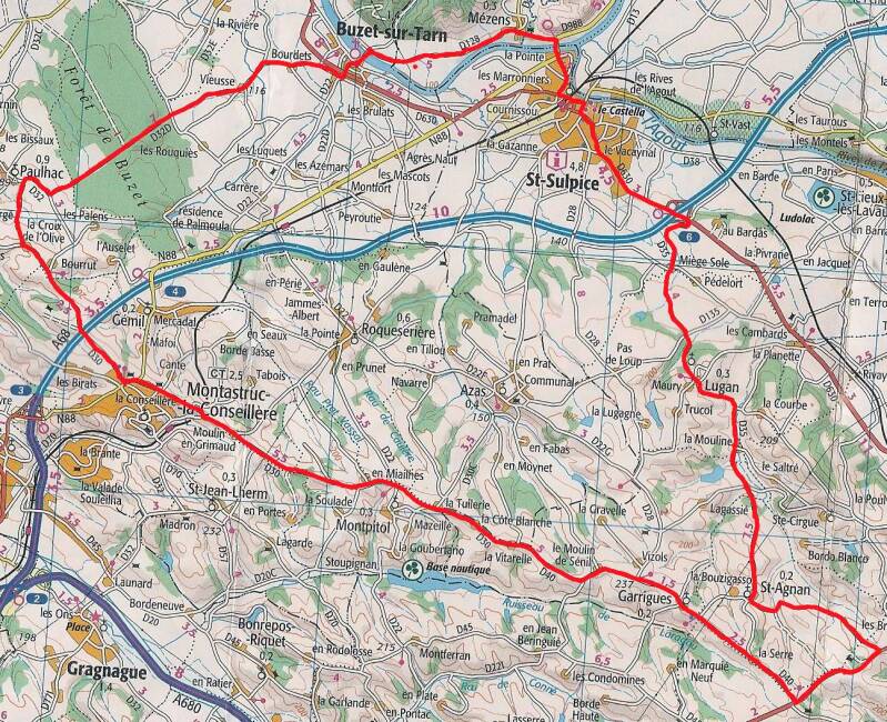 Saint Sulpice, D630, D35, Lugan, Saint Agnan, D112, Poudreux, D40, Garrigues, En Mialhes, D30, Montastruc, D32, vers Paulhac, D32b, Buzet, D128, Mezens, D128, D988, Saint Sulpice