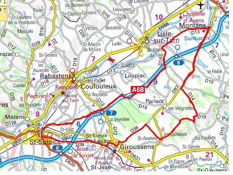 Saint Sulpice, D38, Saint Lieux, Giroussens, Saint joseph, Saint Pierre du Puy, Galinier, Respech, D87, Col des calmettes, D14, Montans, D13, D113, Saint Martin, D14, D13 , le Pendut, Saint Sulpice