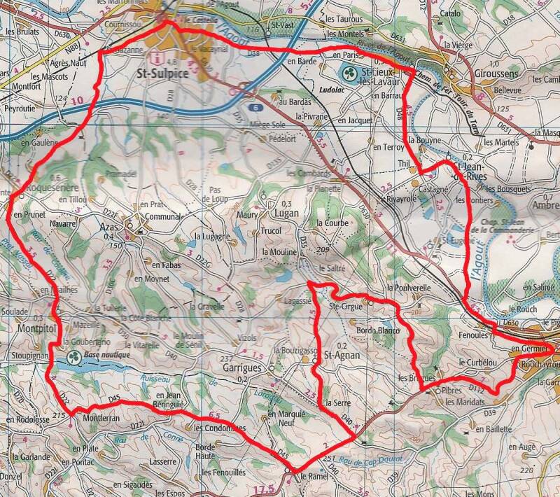 Saint Sulpice, D22, Roqueserière s, D222, Montpitol, Montferrand, D45, Le Beringue, Le Ramel, D112, D40, Saint Agnan, D35, Ste Cirgues, Les Brugues, D112, Lavaur, D630, Saint Jean de Rives, D4, Saint Lieux, D18, Saint Sulpice